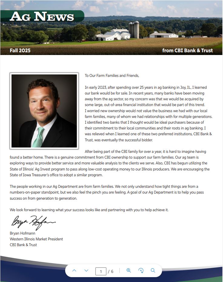 Our communities were founded on the strength of local farmers, their dedicated work ethic and their commitment to great values. Today, local farmers, breeders and ag producers continue to support the local economy through their hard work. CBI Bank & Trust honors this commitment by offering numerous agricultural loan programs, and supporting one of the largest ag lending portfolios in eastern Iowa and west-central Illinois.